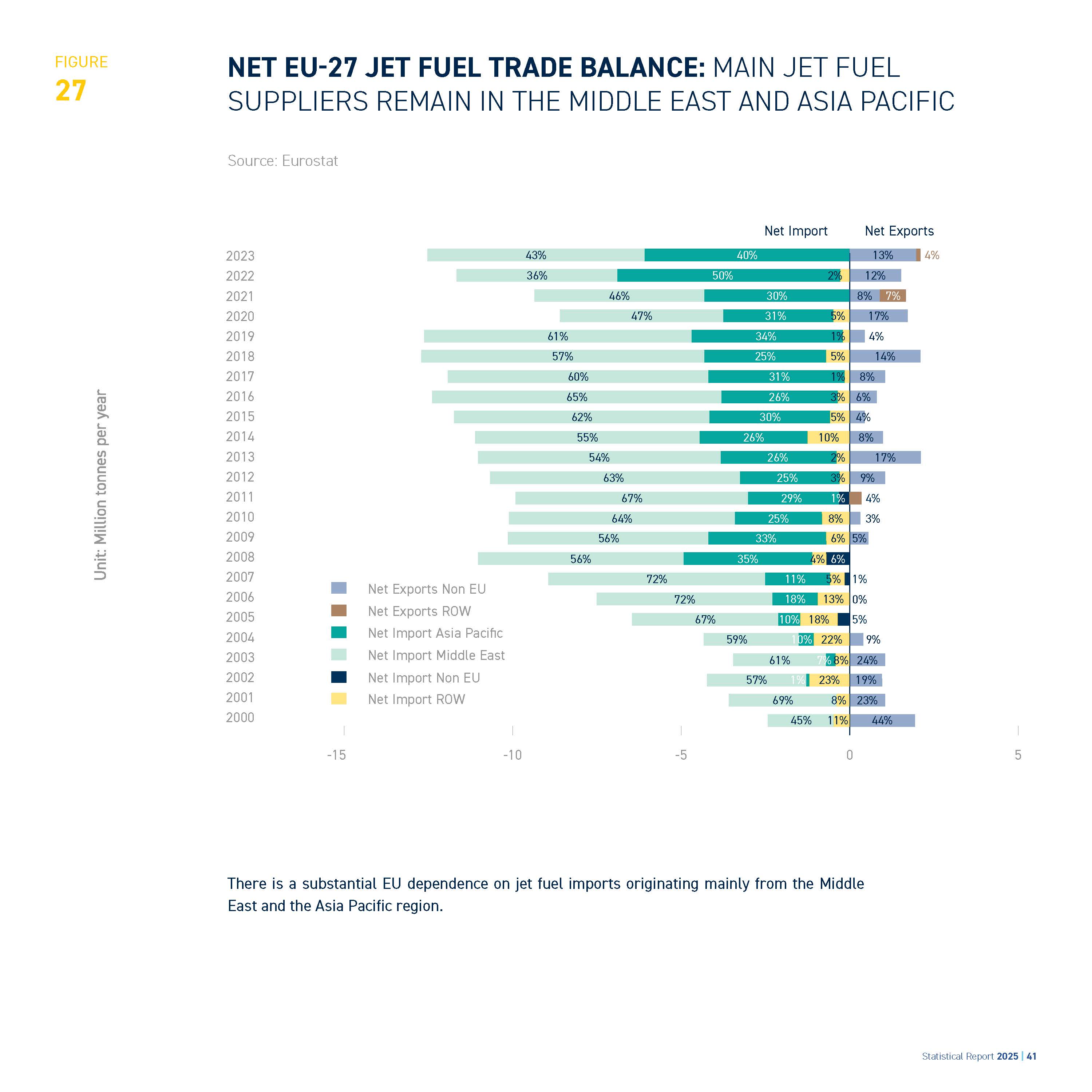 Net EU-27 jet fuel trade balance: main jet fuel suppliers remain in the Middle East and Asia Pacific